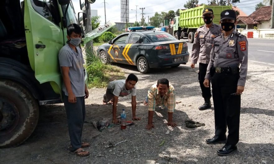 “Petugas di lapangan memberikan teguran lisan kepada dua pelanggar serta sanksi fisik berupa push up terhadap dua orang pelanggar protokol kesehatan,” ujar AKP Hendi.