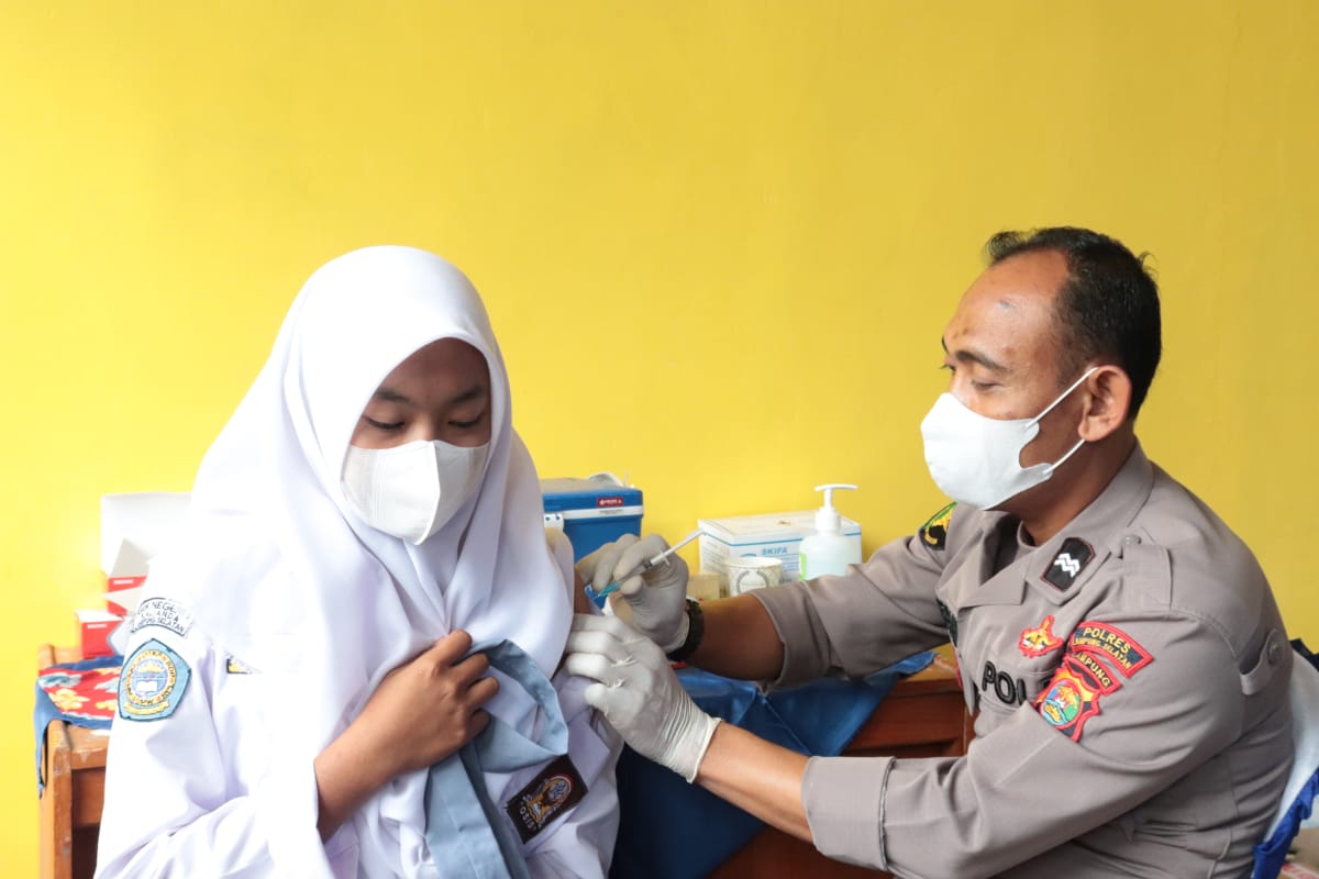 Kasubsipenmas Polres Lampung Selatan Iptu Abqoriyah SH, mewakili Kapolres Lampung Selatan AKBP Edwin, SIK, SH, MSi, Selasa (28/9/2021) mengatakan bahwa dalam rangka percepatan Vaksinasi vaksin covid-19, Gerai Vaksinasi Presisi Polres Lampung Selatan pada hari ini memberikan pelayanan vaksinasi kepada pelajar dan warga masyarakat sebanyak 1.000 Dosis yang dibagi menjadi tiga titik pelayanan ” Tutur Iptu Abqoriyah.