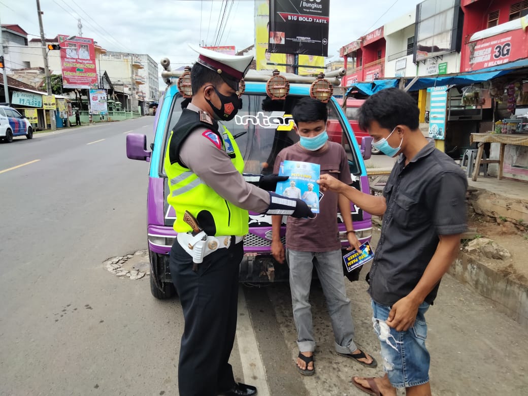 “Kegiatan dengan menghimbau masyarakat agar tetap patuhi aturan berlalu lintas, mematuhi protokol kesehatan. Membagikan masker dan memasang stiker ‘Ayo Pakai Masker’,” kata Iptu Rudi mewakili Kapolres Tanggamus AKBP Oni Prasetya, SIK.