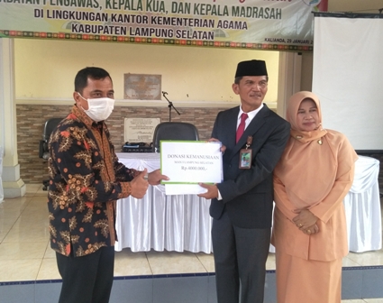 Hasil donasi diserahkan Kepala MAN 1 Lamsel, Ahmad Musopa kepada Kepala Kementerian Agama (Kemenag) Lamsel, Ashari di Kantor Kemenag di Kalianda.