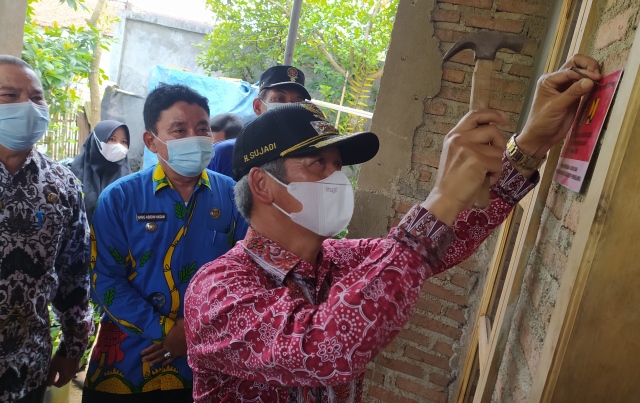Saibumi.com, Pringsewu— Bupati Pringsewu,Lampung, Sujadi memasang peneng atau plakat informasi di salah satu rumah warga penerima program bedah rumah atau bantuan rumah swadaya (BRS).