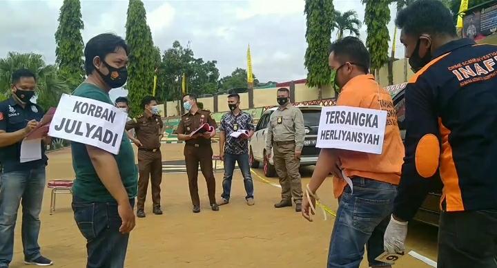 Reka adegan dilakukan langsung oleh tersangka Herli, tiga orang saksi diantaranya 1 perempuan yang merupakan penjual buah-buahan yang melihat langsung kejadian dan 2 teman korban yang berada di dalam mobil yang dikemudikan oleh korban.
