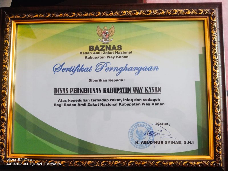 Way Kanan, etalaseinfo.com (SMSI) – Ata kepedulian terhadap pembayaran zakat infak dan sodaqoh, Dinas Perkebunan Kabupaten Way Kanan menerima Penghargaan Dari BAZNAS Way Kanan
