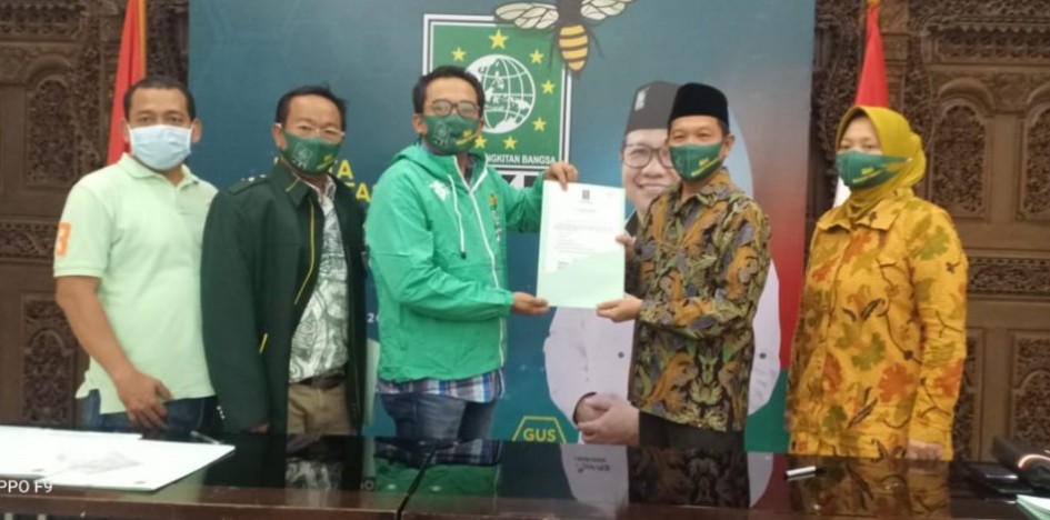 Penyerahan rekomendasi Form B1.KWK Nomor 3779/DPP/01/VIII/2020 kepada HI-MEL langsung oleh Sekjend PKB M Hasanudin Wahid, di Kantor PKB Komplek Widya Karya Kebayoran Baru Jakarta Selatan.