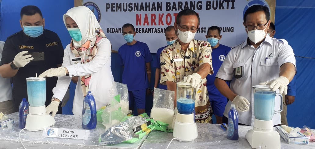 BANDAR LAMPUNG : Badan Narkotika Nasional (BNN) Provinsi Lampung memusnahkan 3,12 Kg narkotika jenis sabu, hasil tangkapan sindikat yang dilakukan tiga narapidana di Lembaga Pemasyarakatan (Lapas) Kelas Rajabasa Bandar Lampung, pada Jumat (11/12/2020). Pemusnahan dilakukan di TPI Lempasing, yang berbatasan antara Bandar Lampung dengan Pesawaran, Rabu (30/12/2020).