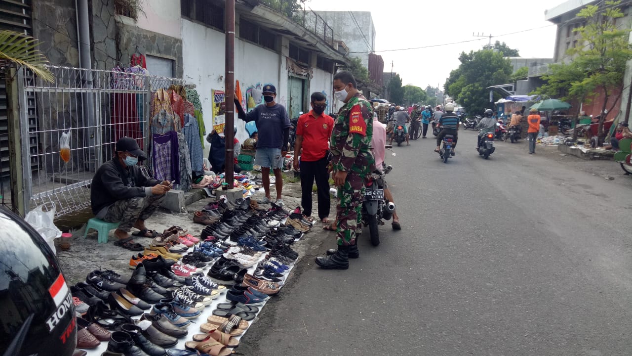 Babinsa Kelurahan Purwodiningratan Koramil 04/Jebres Kodim 0735/Surakarta Serma Samsuri selalu melakukan upaya dalam mencegah penyebaran Covid 19 yakni mengecek penerapan protokol kesempatan (Protkes) di wilayah terutama tempat-tempat berkerumun warga seperti di Klitikan jalan Pasar Rejisari Kelurahan Purwodiningratan Kecamatan Jebres Kota Surakarta, Minggu (31/01/2021).