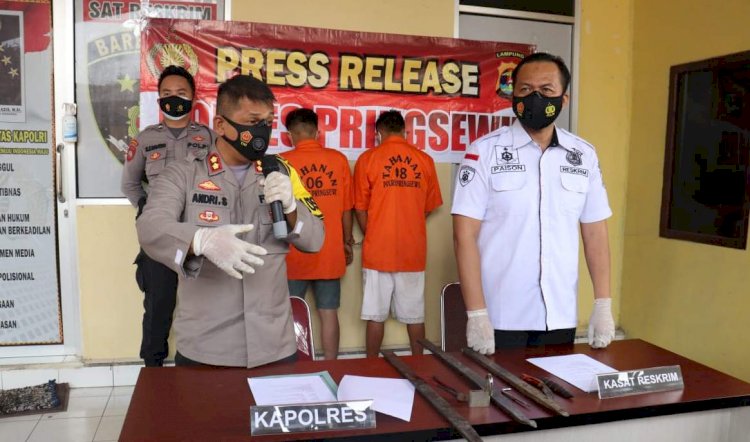Kapolres Pringsewu AKBP Hamid Andri Soemantri melakukan ekspokse ungkap kasus pencurian dengan pemberatan (curat) spesialisasi pencurian baterai tower dan minimarket Alfamart.