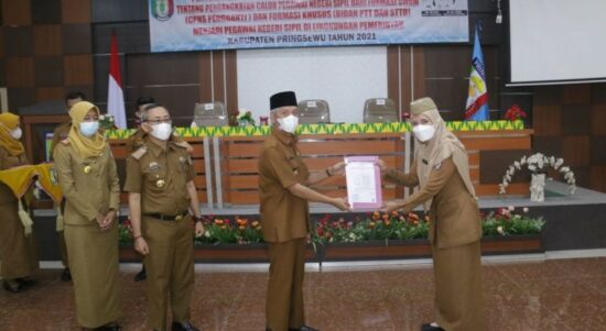 Bandarlampung-Bupati Pringsewu, Sujadi menyerahkan SK PNS kepada 17 calon Pegawai Negeri Sipil Daerah (CPNSD) Kabupaten Pringsewu . “Ke-17 CPNS yang menerima SK